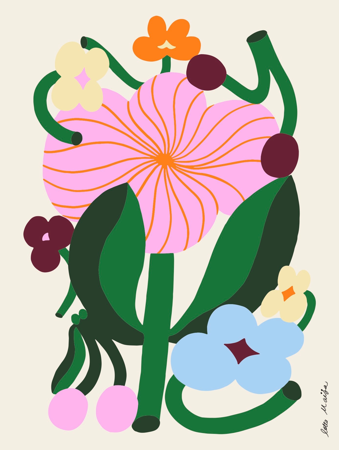 Spring is a colorful celebration of renewal after the quiet of winter. The artwork captures a playful, whimsical spirit, echoing the happiness of seeing the first flowers burst into life. Behind the design is Lotta, whose background in textile design and printmaking has shaped her love for flat color surfaces and bold compositions.